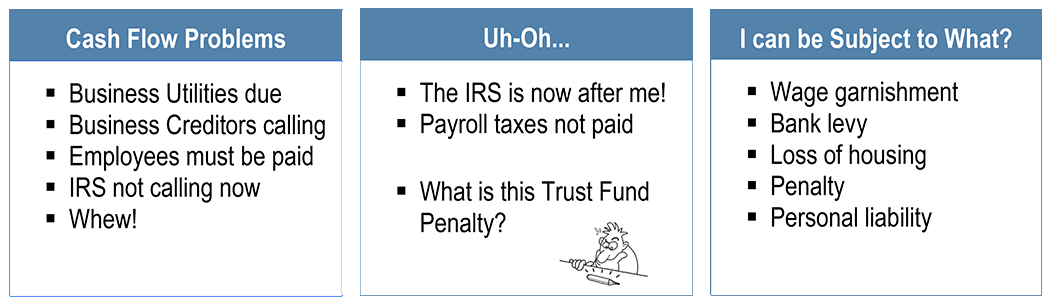 Upon reading of the above, reflect that the fact patterns in the above examples are not rare. They are very real world situations, and Trust Fund Recovery cases routinely involve similar type fact patterns. Yet, Taxpayer’s continue in their failure to understand the civil and potential criminal exposure they face.